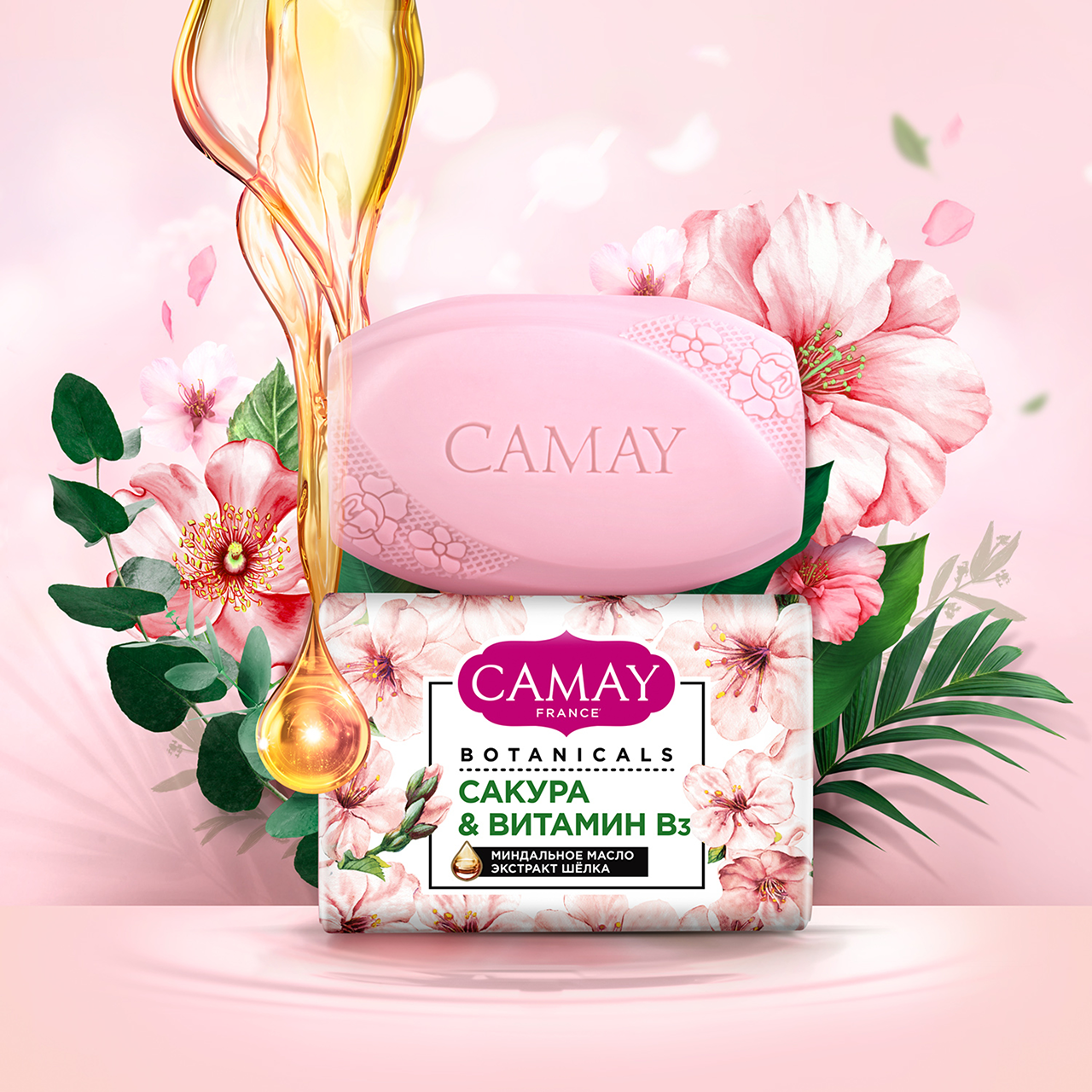 Частое мытье и дезинфекция рук могут оставлять ощущение сухости и стянутости. Туалетное мыло Camay Botanicals Сакура — это деликатное очищение с нежным ароматом цветущей сакуры.